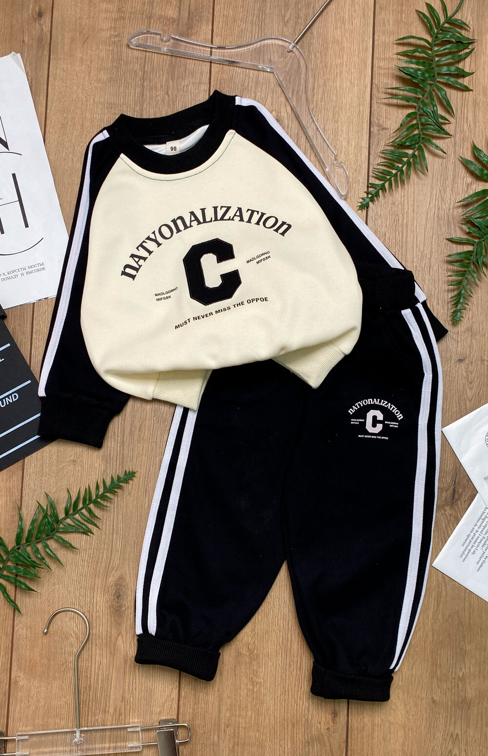 Костюм М 90,100,110,120,130(2-5лет) свитшот+брюки/надпись "natyonalization C"/манжеты/вертик полосы