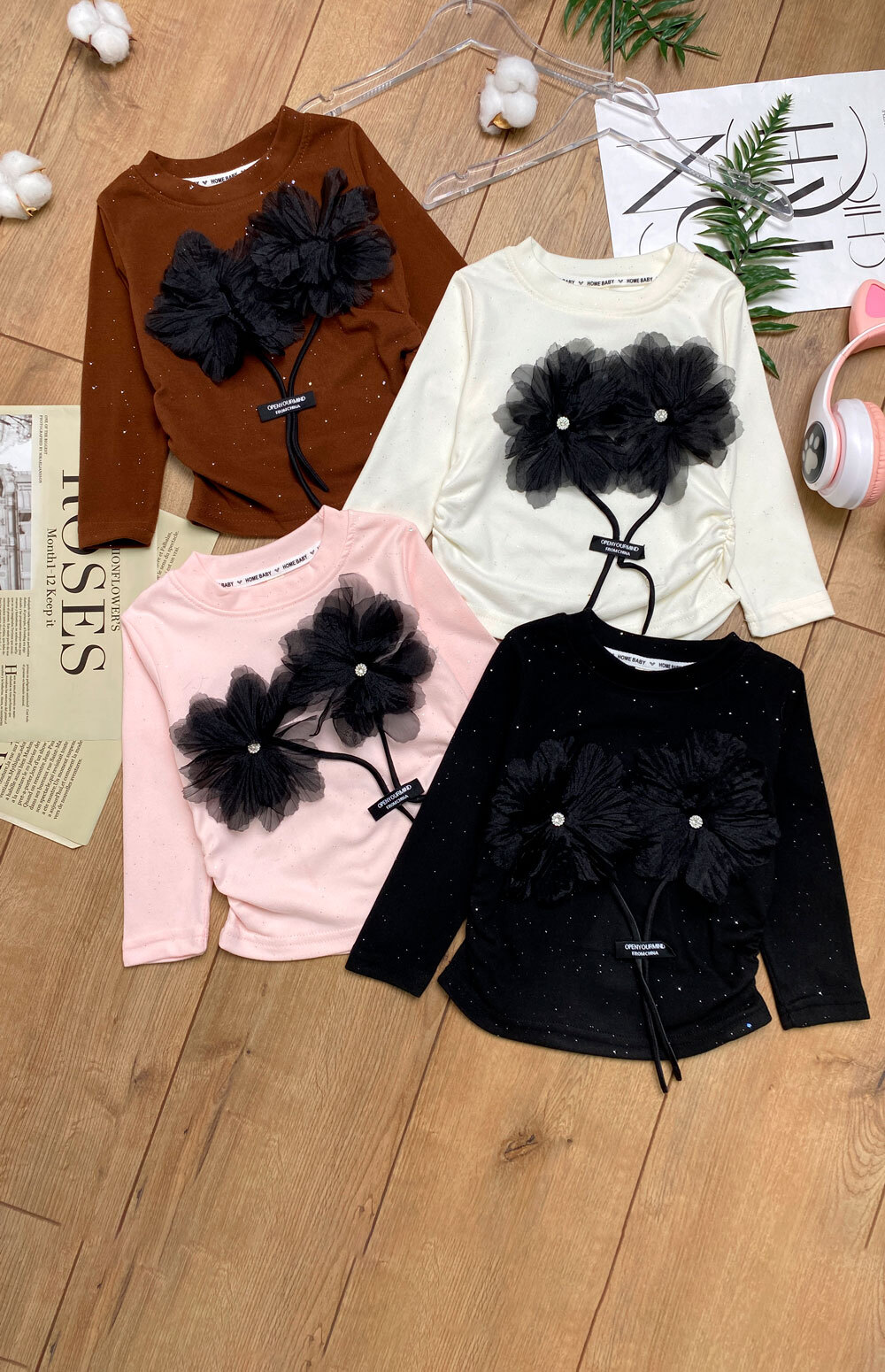 Лонгслив Д 90,100,110,120,130(2-5лет) резинки-завязки по бокам/глитер-блестки/апликация черныйцветок
