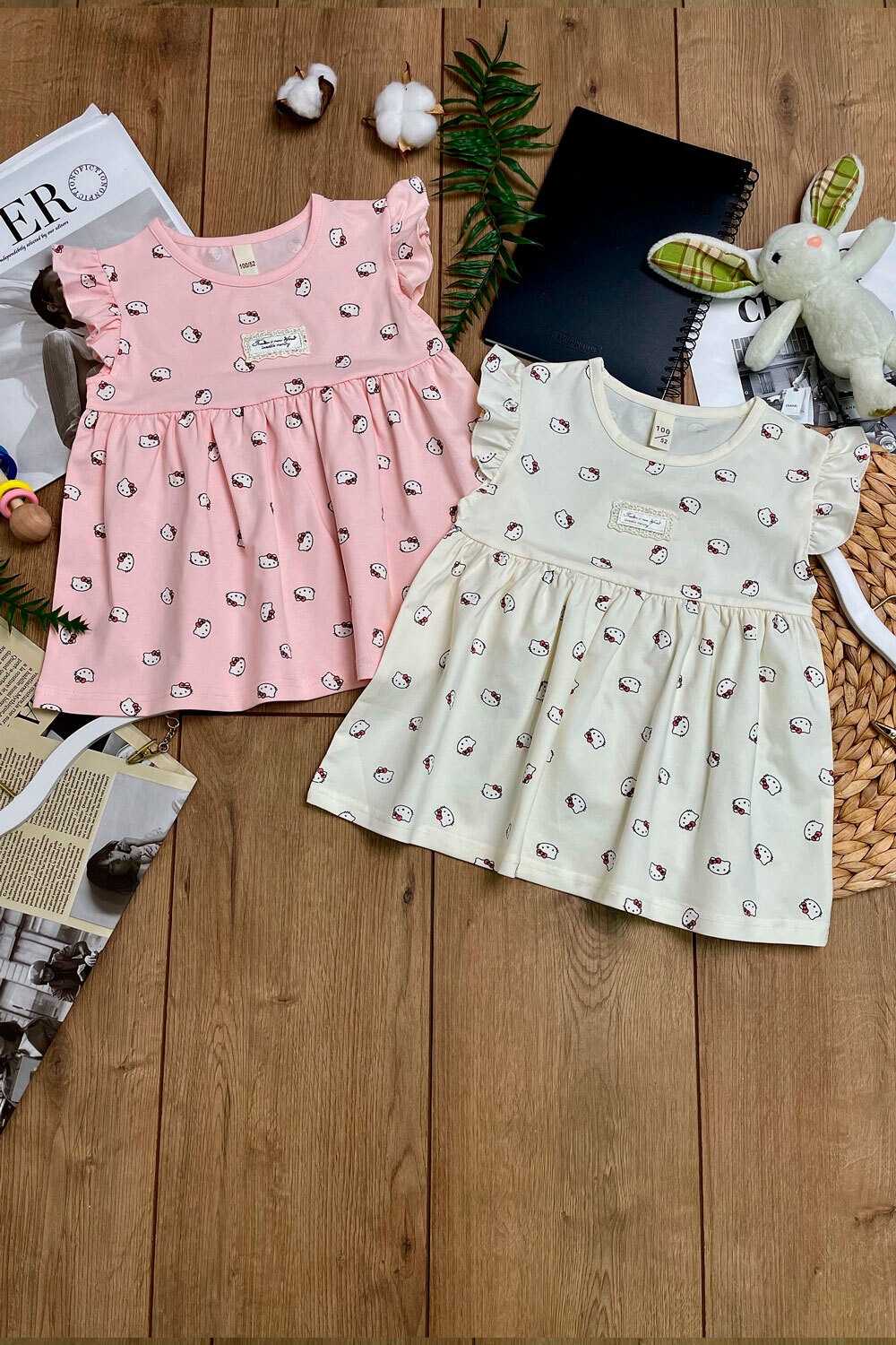 Платье 90,100,110,120,130(1-5лет) к.р./однотонное/принт "кошачья мордашка с бантом"/надпись в центре