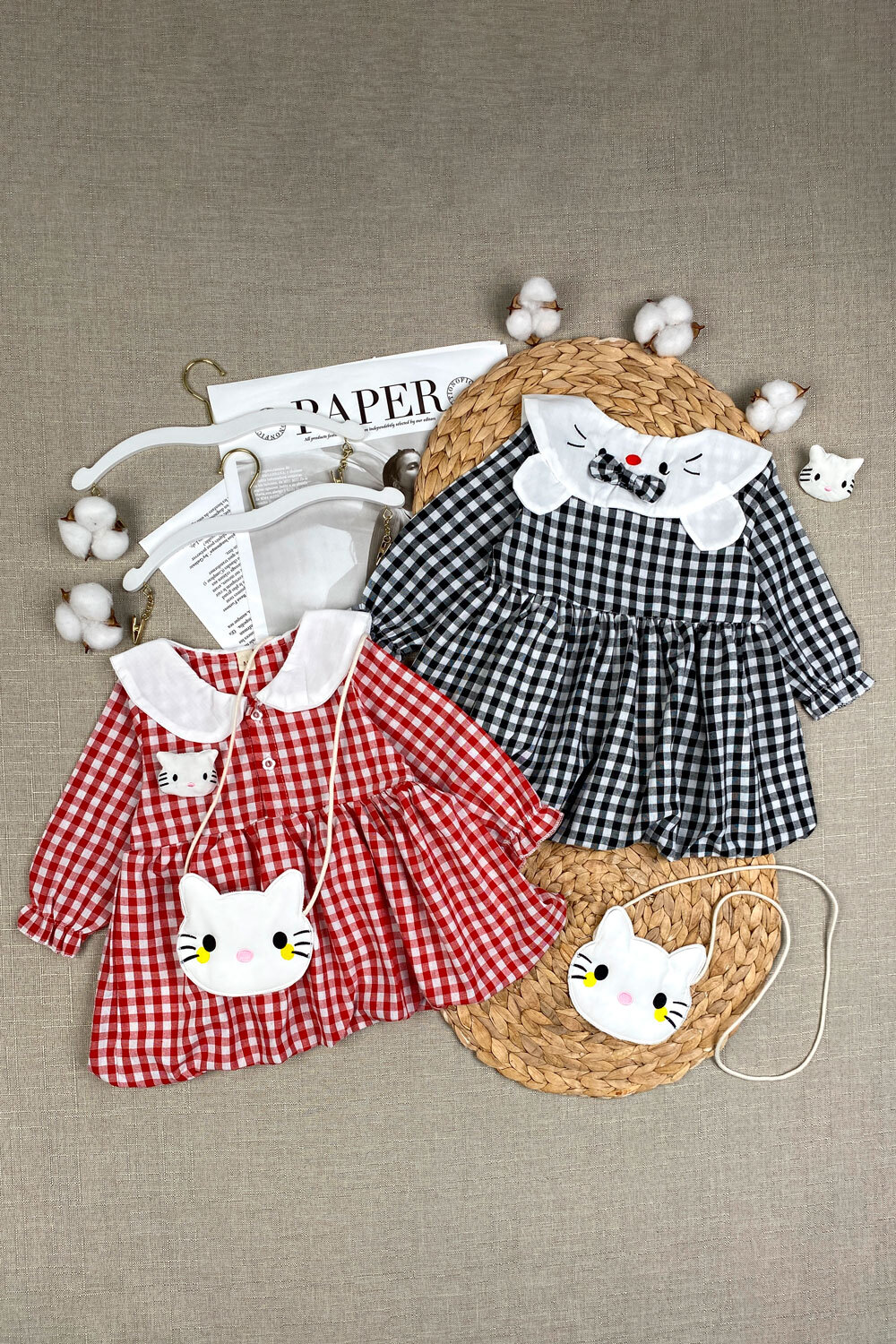 Платье 80,90,100,110(1-4года) сумочка/воротник/клеточка/пуговицы/нашивки котик