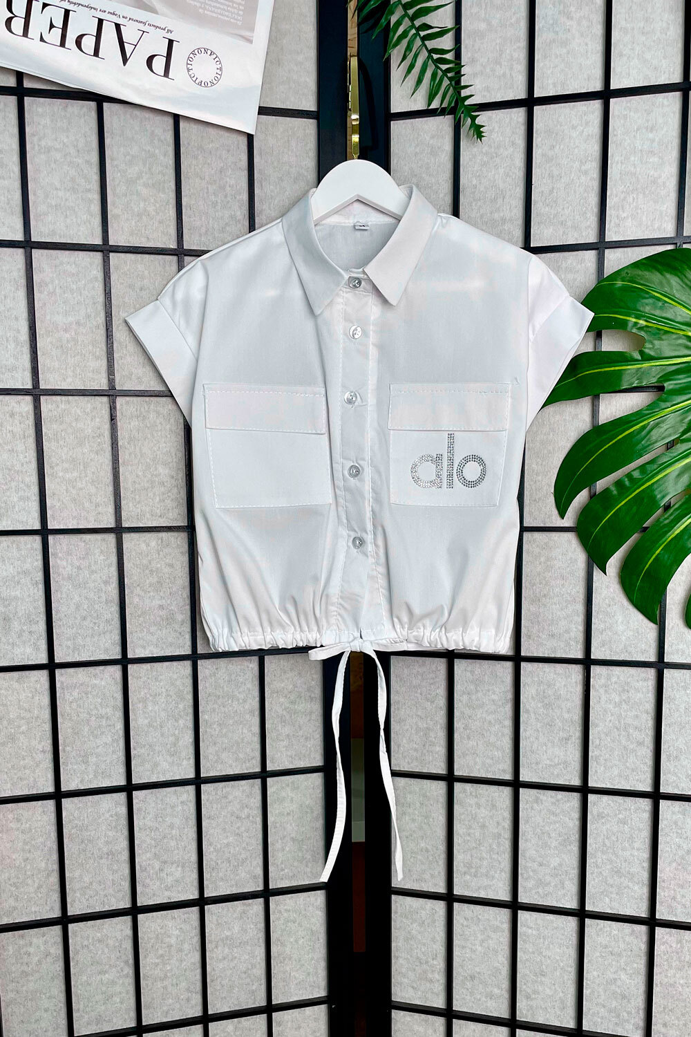 Рубашка Д 122,128,134,140,146(34-42) Школа/к.р/пуговицы со стразами/надпись ALO/карманы/низ завязки