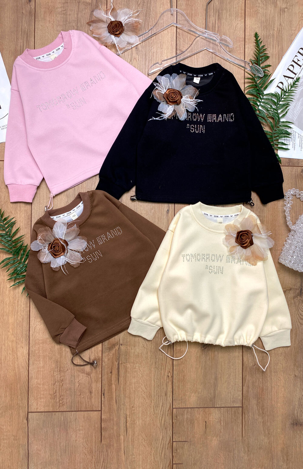 Свитшот Д 100,110,120,130,140(3-6лет) надпись "TOMORROW BRANO SUN"/цветок-роза на плече/атлас