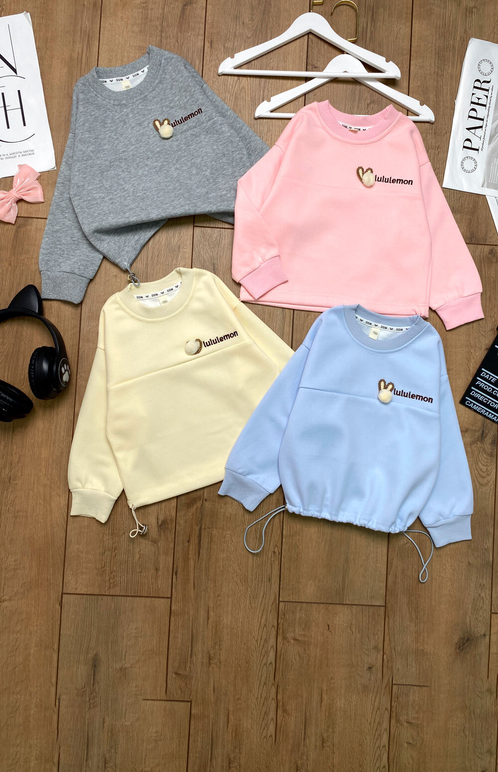Свитшот Д 100,110,120,130,140(3-6лет) надпись "lululemon"/нашивка-мягкий шарик/ушки/вытачка